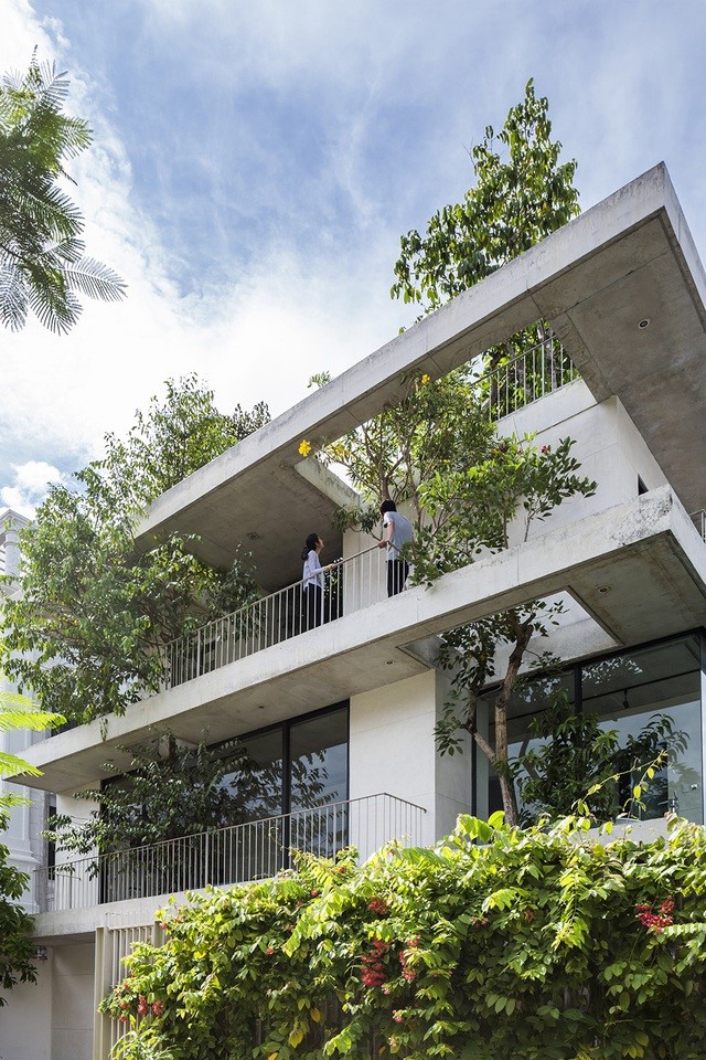 Vườn cây đặt xen kẽ giữa các không gian, lệch nhau theo phương đứng, kết hợp việc thiết kế các gian phòng với hai mặt là cửa kính trượt. Ý tưởng này không những giúp cải thiện vi khí hậu, vừa tạo cảm giác rộng rãi, mà còn tăng sự tương tác giữa các thành viên trong gia đình.