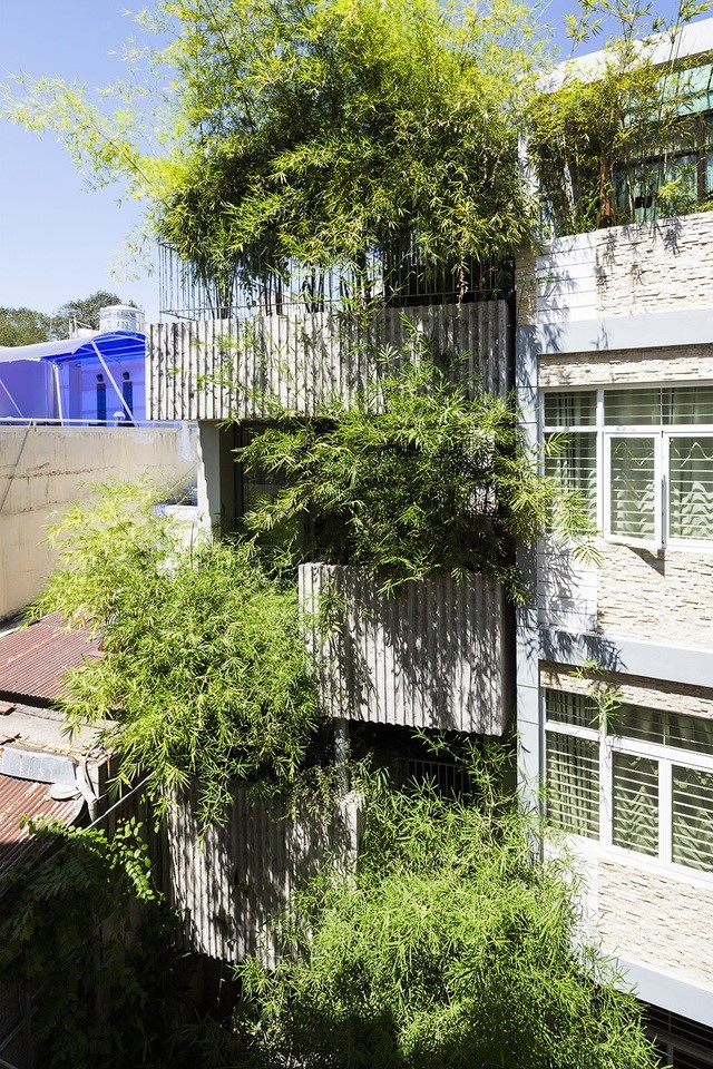 Với ngôn ngữ thiết kế thống nhất, ngoài việc trồng tre trên mặt tiền, tre còn được dùng làm ván khuôn cho các vách bê tông của bồn cây. Vân tre trên bề mặt bê tông giúp làm giảm sự khô cứng và nặng nề của tường bê tông truyền thống và do đó cải thiện chất lượng thẩm mỹ tổng thể của ngôi nhà.