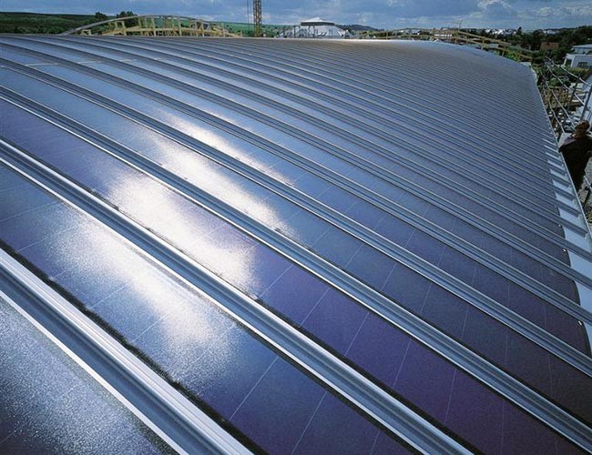 Trong bài viết trước chúng tôi đã đưa ra lợi ích tích hợp mái nhôm EuroZip với ứng dụng công trình xanh. Bên cạnh đó hệ mái nhôm EuroZip của chúng tôi còn có thể lắp đặt hệ thống pin năng lượng mặt trời trên mái. Hệ thống mái nhôm EuroZip tích hợp pin năng lượng mặt trời bao gồm mái hợp kim nhôm cách âm cách nhiệt chống cháy cùng hệ thống pin năng lượng mặt trời được tích hợp ngay trên bề mặt mái mà không cần sử dụng thêm phụ kiện nào. Pin năng lượng mặt trời được ghép nối từ nhiều tế bào quang điện, các pin mặt trời hiện đang được sử dụng rộng rãi vì chúng rất dễ chuyển đổi và dễ dàng lắp đặt trên các tòa nhà và các cấu trúc khác. Pin mặt trời có thể cung cấp nguồn năng lượng sạch và tái tạo, do vậy là một nguồn bổ sung cho nguồn cung cấp điện chính thông thường. Việc sử dụng hệ mái tích hợp pin năng lượng này giúp người dùng tận dụng tối đa ưu điểm của chúng. Nó cũng sẽ tác động tới cơ cấu của công trình và là yếu tố quan trọng trong mối liên hệ giữa hệ thống công trình và môi trường.
