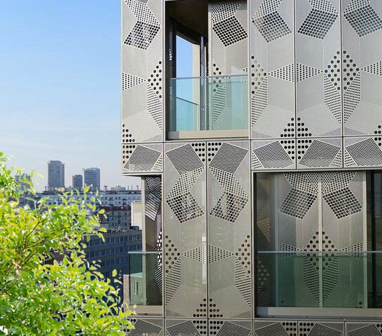 Tấm nhôm đục lỗ là vật liệu ốp và trang trí kiến trúc phổ biến nhất để xây tường, mặt tiền, cột, trần nhà, mái nhà, mái vòm hoặc ban công .