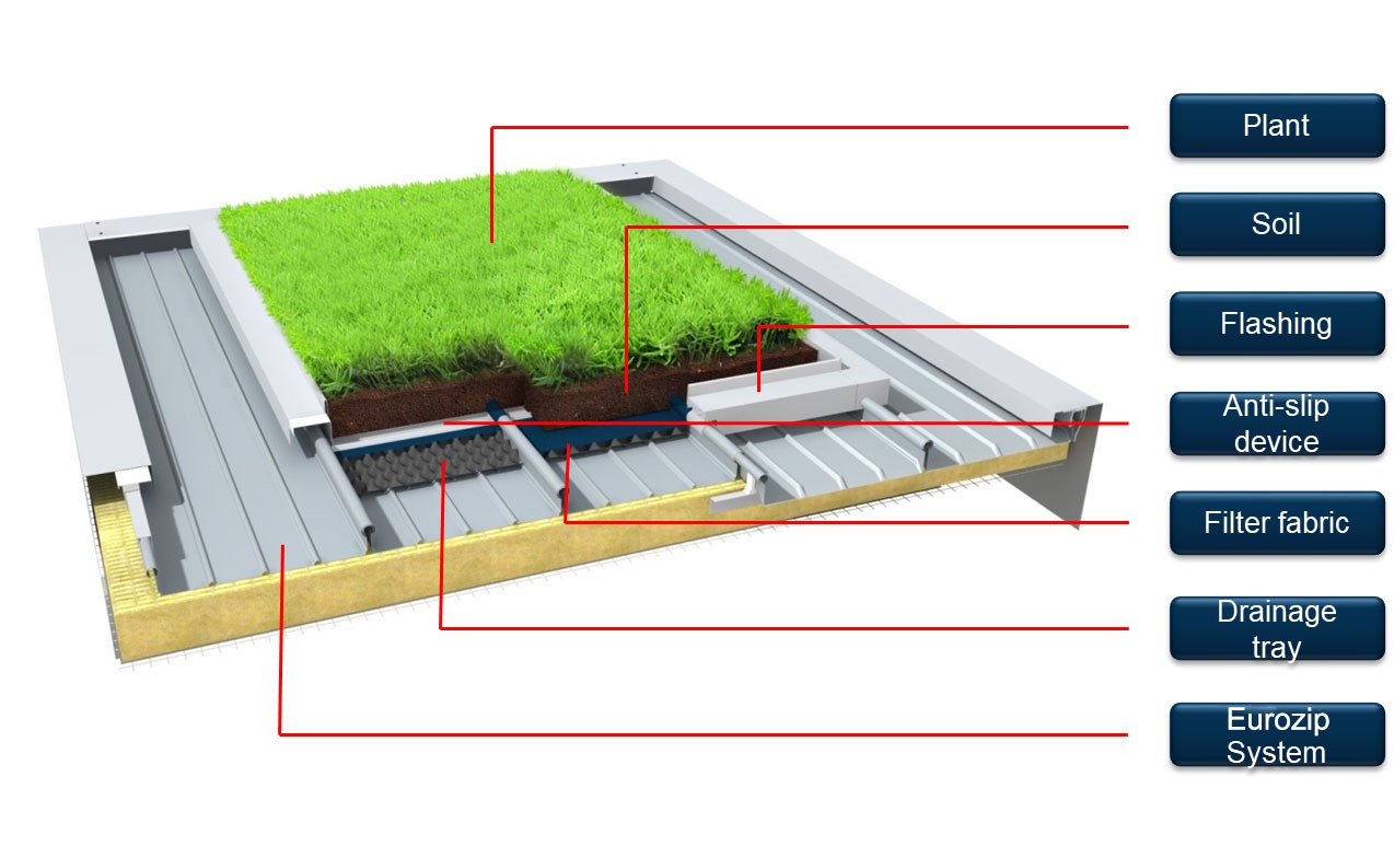Mái nhôm sườn đứng Eurozip đáp ứng các yêu cầu kỹ thuật và thiết kế độc đáo của từng công trình. Hệ thống mái nhôm nhẹ này cải thiện cách âm, cách nhiệt và rất tốt về tài nguyên - các tính năng thiết yếu cho kiến trúc thông minh và thân thiện với môi trường. Mái Eurozip kết hợp thành công lợi ích môi trường với thiết kế kiến trúc tuyệt đẹp. Việc trồng cây xanh trên mái Eurozip tạo môi trường xanh thân thiện với môi trường giống như một tấm thảm tự nhiên thay đổi theo mùa.